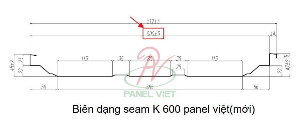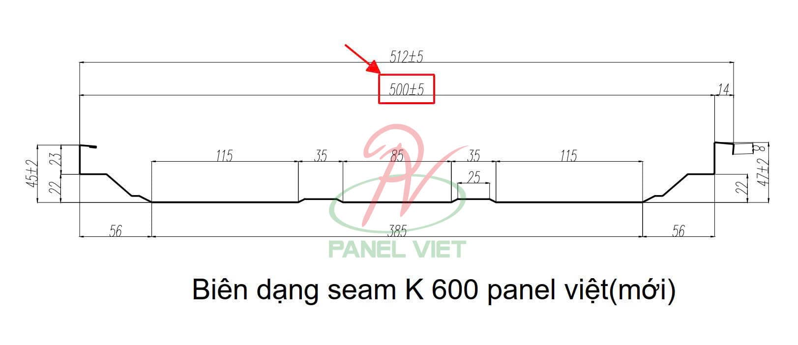 - Seam K600 Panel Việt (mới): bề rộng hiệu dụng 500mm, biên dạng gân cứng xen kẽ, tạo rãnh khóa đôi vững chắc.